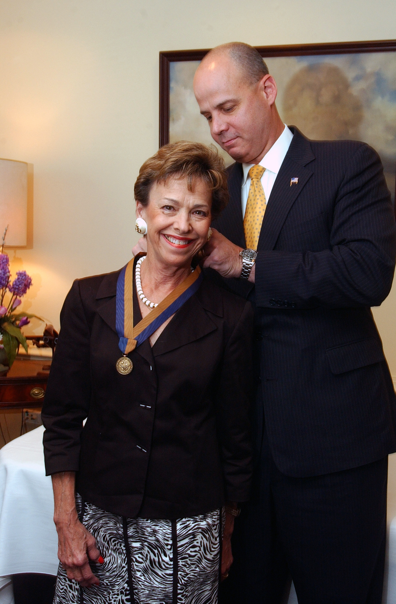 1.75k | Washington, D.C. 26 July 2005; Under Secretary of the Navy, the Honorable Dino Aviles presents the Meritorious Public Service Award to Mrs. Margaret Dalton in a ceremony held at the Pentagon. Dalton was recognized for her service to the Navy while serving as president of the Society of Sponsors from October 2003 to May 2005. Her participation in various ships christenings, commissionings and other significant events contributed in helping to educate the public and military personnel about the traditions of the Navy. Mrs. Margaret Dalton was the sponsor of the Seawolf (SSN-21). |