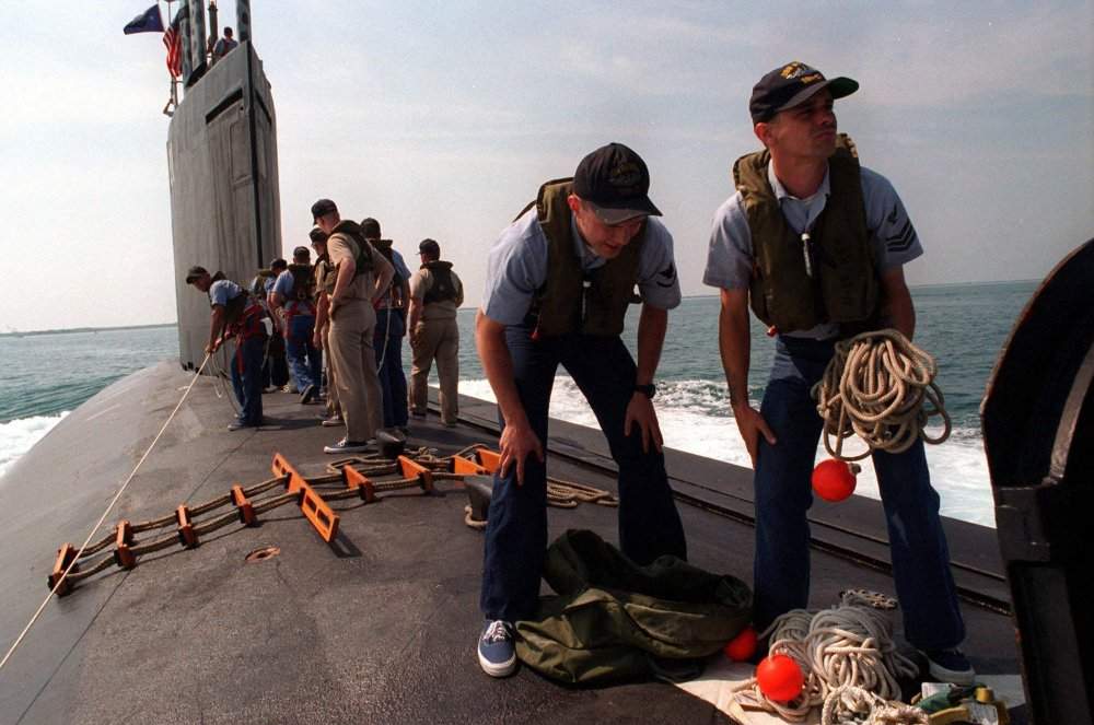 417k | Crew members move 'top-side' to make final preparations for arrival pier side in Port Canaveral, FL. 3 July 1997. Seawolf (SSN-21) was submerged for 3 days during her most recent sea trial from the submarine base in Groton, CT. | USN photo # N-6483G-025 by Chief Photographer's Mate John E. Gay, courtesy of news.navy.mil. | |