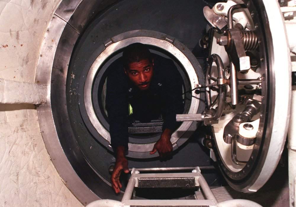 72k | Electrician 2nd Class Keith Davis from St. Croix, Virgin Islands, egresses from the main hatch aboard the nuclear powered attack submarine Seawolf (SSN-21). | USN photo # N-6483G-010 by Chief Photographer's Mate John E. Gay, courtesy of news.navy.mil.& submitted by Bill Gonyo. | |