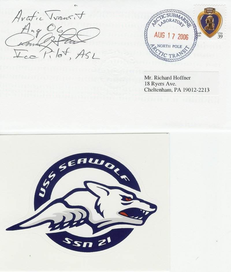56k | Commemorative post mark on the occasion of Seawolf's (SSN-21) Arctic Transit on 17 August 2006. | Photo courtesy of Jack Treutle (of blessed memory). | |