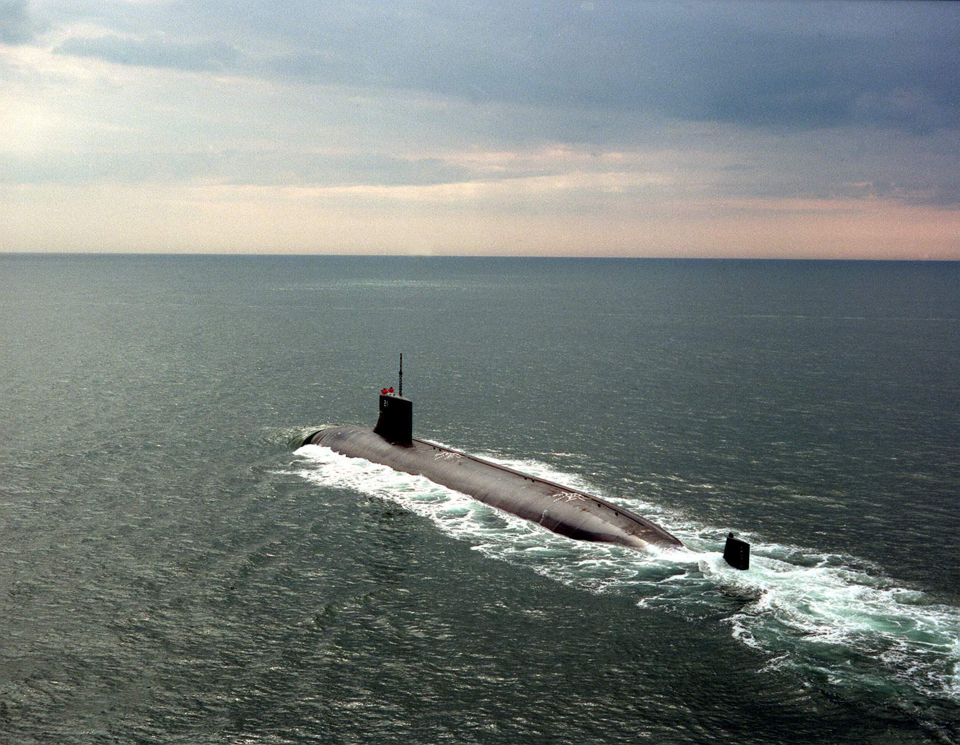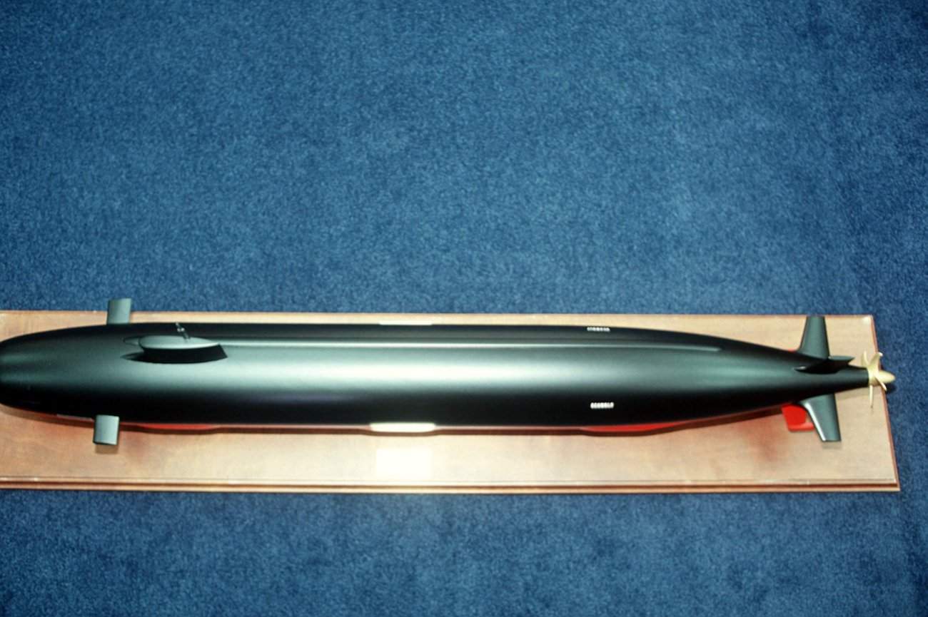 110k | A topside view of the model of the proposed SSN-21 class nuclear-powered attack submarine Seawolf (SSN-21) on display at the Pentagon on 1 February 1990. | USN photo # DN-ST-90-05175, by PH1 Harry Gerwein, from the Department of Defense Still Media Collection, courtesy of dodmedia.osd.mil. | |