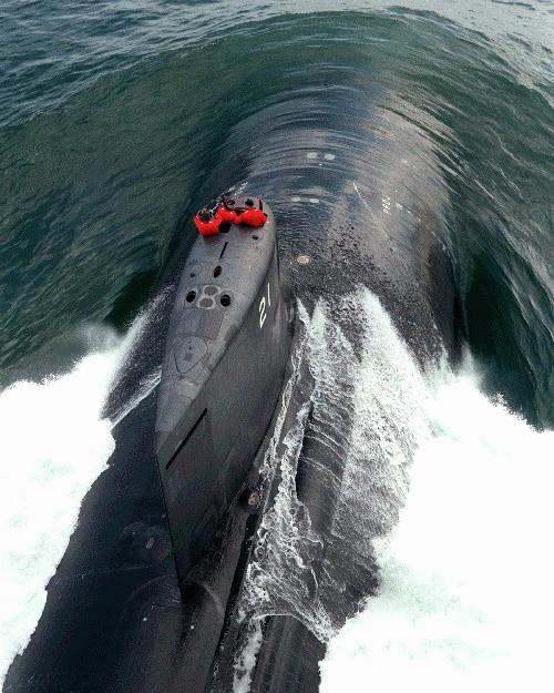 351k | 7,400 tons of Seawolf (SSN-21) makes an impression in the Atlantic during Bravo sea trials at Groton, Ct., 16 September 1996. | USN photo # V-0000B-006, courtesy of Electric Boat Corporation by Jim Brennan, courtesy of news.navy.mil. | |