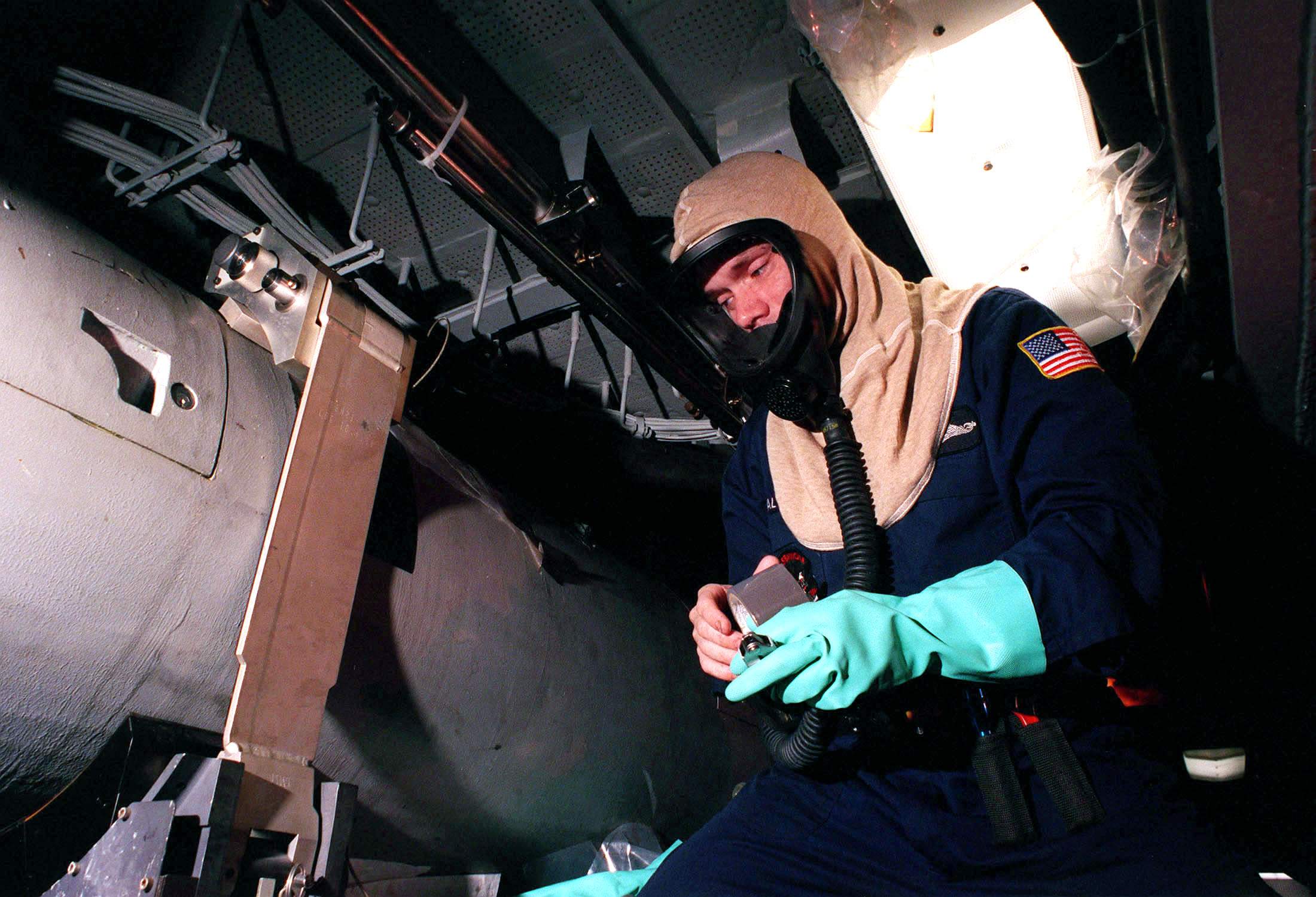 297k | A damage control team conducts a simulated missile auto-fuel leak, emergency spill response drill, on board the Navy's nuclear attack submarine, Seawolf (SSN-21) on 3 July 1997. | USN photo # N-6483G-021 by Chief Photographer's Mate John E. Gay, courtesy of news.navy.mil. | |