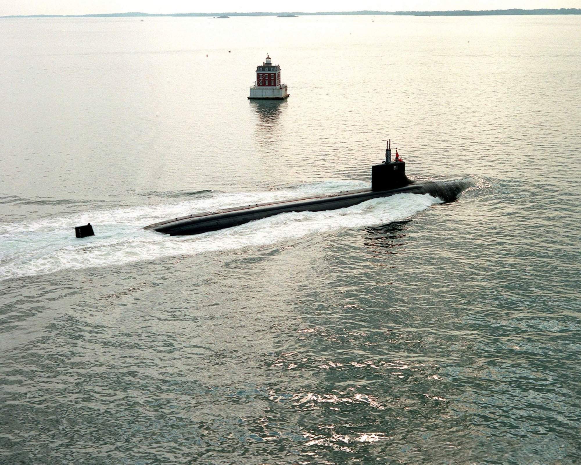 70k | Through an early morning fog and rain, Seawolf (SSN-21), transits the Thames River on her way from the Naval Submarine Base, Groton, Conn., to Narragansett Bay to conduct initial sea trials on 3 July 1996. Sea trials include various tests of the ship's propulsion systems and the first underway submergence. | USN photo by Journalist 2nd Class Gerald M. Johnson. Courtesy of chinfo.navy.mil | |