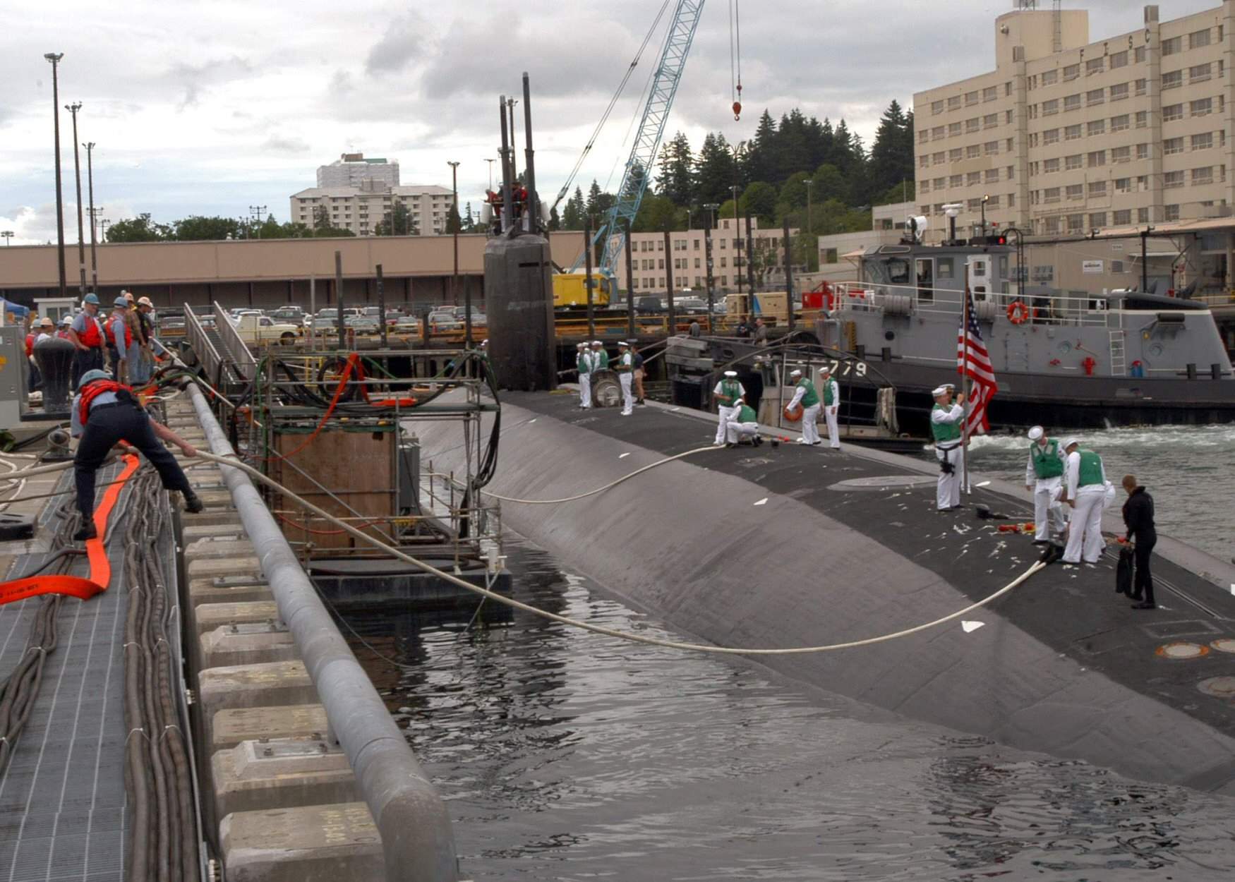 218k | Naval Base Kitsap, Bremerton Sailors on Delta Pier heave line in order help moor the fast attack submarine Seawolf (SSN-21) which transferred from Groton, Connecticut to her permanent duty station in Bremerton. Seawolf; second of her class to arrive and reside in Washington was designed to seek and destroy enemy submarines and surface ships, project power ashore with Tomahawk cruise missiles and special operation forces, carry out intelligence, surveillance and reconnaissance missions, support Carrier Strike Groups, and engage in mine warfare. | USN photo # N-4386D-002, by Mass Communication Specialist 3rd Class Scott Dagendesh courtesy of news.navy.mil. | |