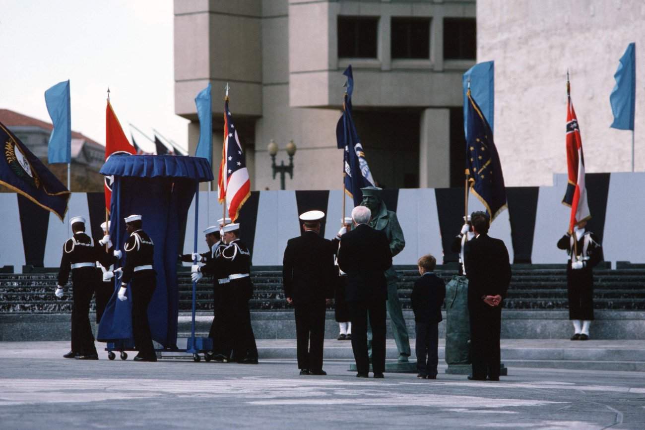 95k | A Navy ceremonial guard unveils The Lone Sailor statue during the dedication ceremonies for the US Navy Memorial on 25 May 2002 in Norfolk. The seven-foot bronze statue is a composite of the US Navy bluejacket of the past, present and future and is molded with artifacts from eight US Navy ships: the iron-clad steamer Ranger, frigates Constitution and Constellation, steamer Hartford, battleship Maine, light cruiser Biloxi (CL-80), aircraft carrier Hancock (CV-19) and the nuclear-powered attack submarine Seawolf (SSN-21). | USN photo # DN-ST-88-00823, by PH1 Chuck Mussi, from the Department of Defense Still Media Collection, courtesy of dodmedia.osd.mil. | |