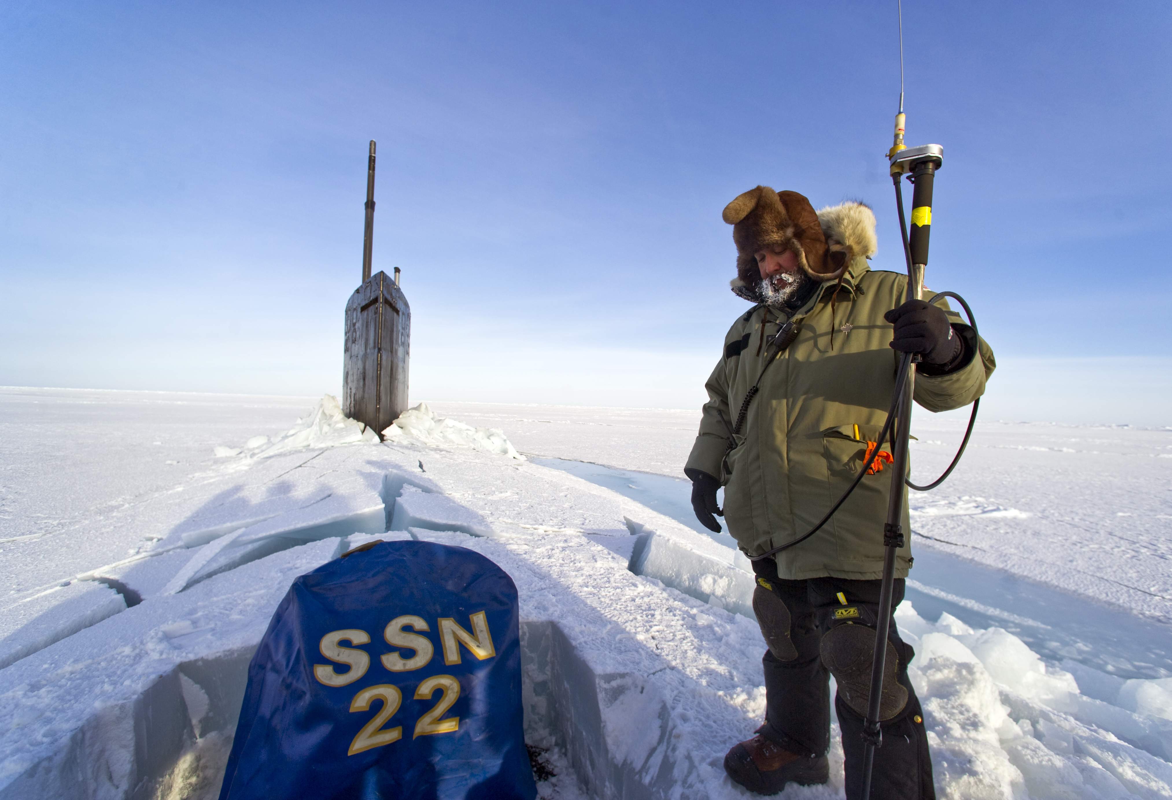 588k | Hector Castillo watches daily operations while communicating with the command hut at the Applied Physics Lab Ice Station on 19 March 2011 as the Seawolf-class attack submarine Connecticut (SSN-22) prepares to submerge under the ice during ICEX 2011. | USN photo # N-UH963-418 by Mass Communication Specialist 2nd Class Kevin S. O'Brien. | |