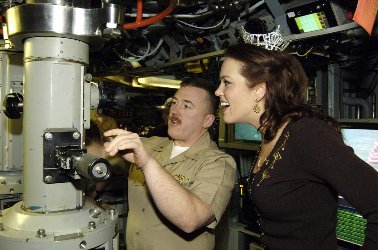 105k | Cmdr. Daniel Christofferson, commanding officer of the fast attack submarine Connecticut (SSN-22), shows Miss Connecticut 2006 Heidi Voight the ship's periscope during a tour of the boat on 6 February 2007. | USN photo # N-8467N-002 by John Narewski, courtesy of navy.mil. | |