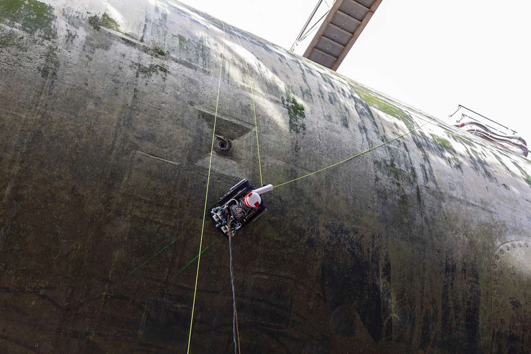 817k | BREMERTON, Washington (Apr. 01, 2019) A prototype hull-climbing robot conducts its first test on an actual vessel, the Seawolf-class attack submarine Connecticut (SSN-22), in dry dock at Puget Sound Naval Shipyard and Intermediate Maintenance Facility (PSNS & IMF). The hull climber robot is the result of a partnership between PSNS & IMF and the Naval Undersea Warfare Center Division, Keyport, that sought to design a system able to provide a faster, safer and more cost-effective method of completing required hull inspections on U.S. Navy submarines. | U.S. Navy photo File# 190401-N-TS621-1002 picryl.com by Jeb Fach/Released via John Spivy. | |