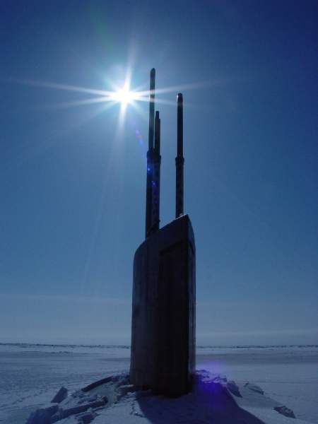 140k | Mid-day sun shines over the sail of the Connecticut (SSN-22), at the APLIS 2003 Ice Camp, April 2003. | Courtesy of csp.navy. | |