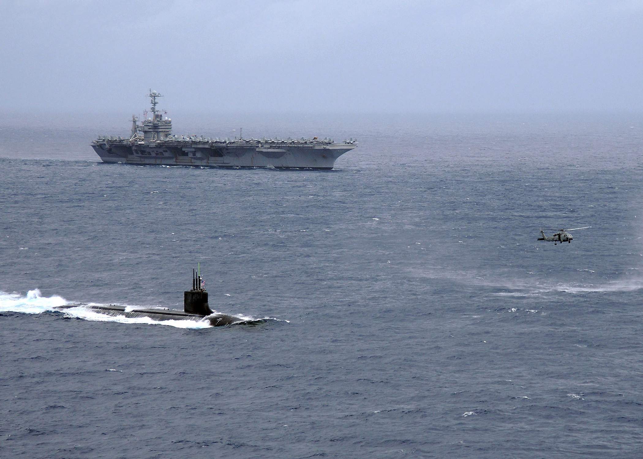 289k | The aircraft carrier George Washington (CVN-73) and the Connecticut (SSN-22) are underway in the Pacific Ocean as an HH-60H Sea Hawk helicopter from the Chargers of Helicopter Anti-Submarine Squadron (HS) 14 hovers nearby on 17 November 2009. Ships from the U.S. Navy and Japan Maritime Self-Defense Force are participating in ANNUALEX 21G, a bilateral exercise designed to enhance the capabilities of both naval forces. | USN photo # N-6720T-050 by Mass Communication Specialist Seaman Adam K. Thomas. | |