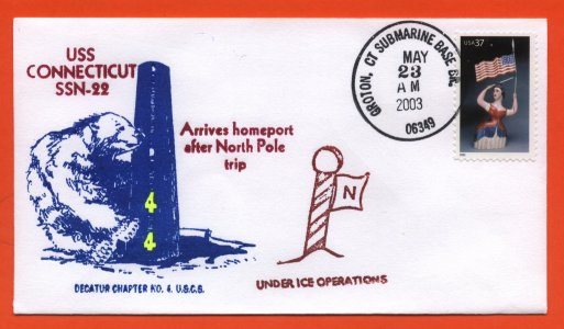 36k | Commemorative post mark of the Connecticut (SSN-22), arriving home from the North Pole, 23 May 2003. | Courtesy of Jack Treutle (of blessed memory). | |