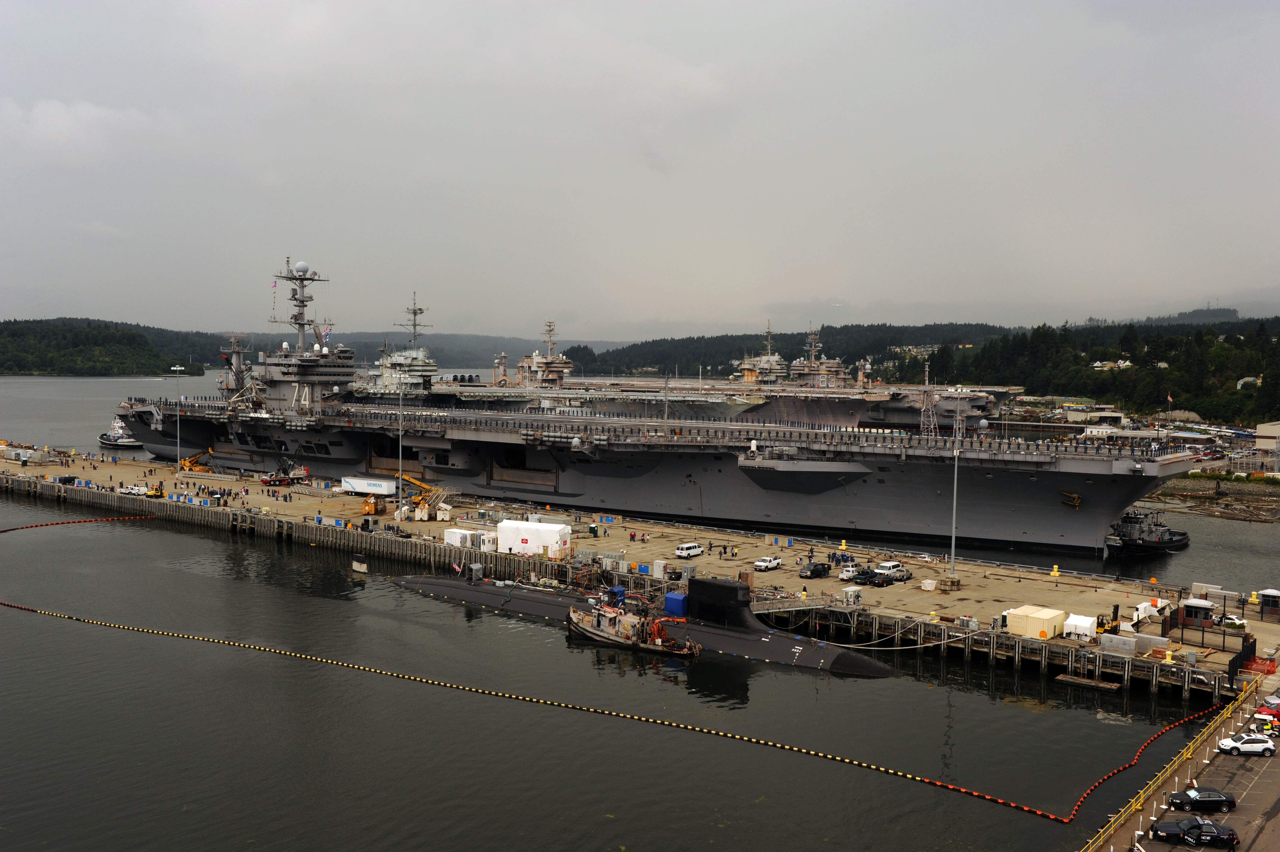 878k | The Nimitz-class aircraft carrier John C. Stennis (CVN-74) departs Naval Base Kitsap on 25 July 2011. John C. Stennis is on its way to the western Pacific Ocean and the Arabian Gulf for a scheduled seven-month deployment. The Connecticut (SSN-22) is alongside. | USN photo # N-RG482-030 by Mass Communication Specialist 2nd Class Kyle Steckler courtesy of navy.mil. via Ron Revees. | |
