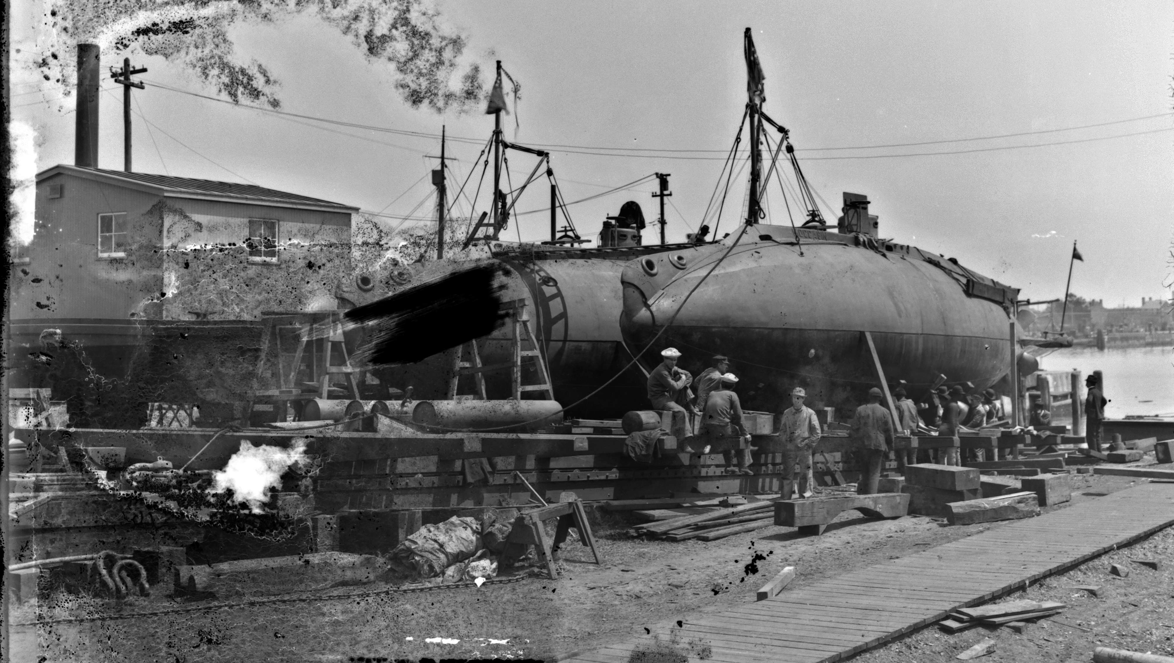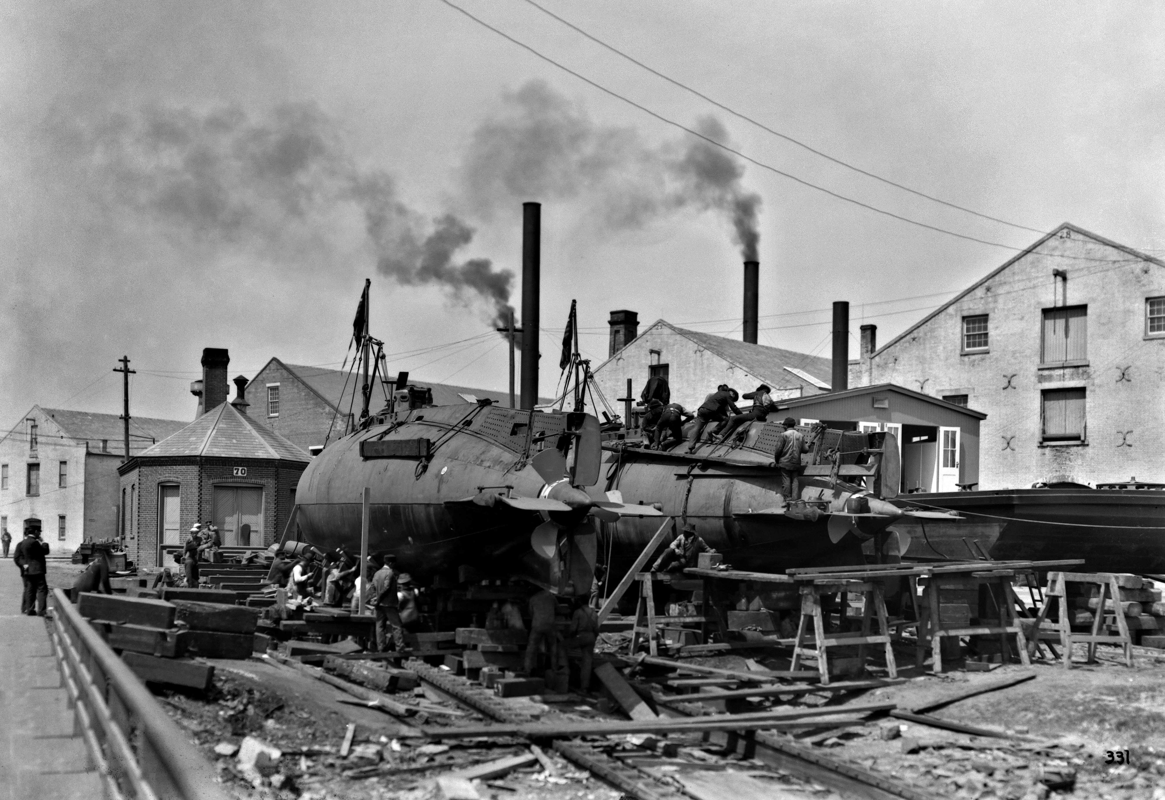 101k | Moccasin (SS-5) fitting out at the Electric Boat Company/Holland Torpedo Boat Company facility, New Suffolk, Long Island, New York, circa 1903. The incomplete submarine Plunger (of 1895) is in the background. | USNHC photograph # NH 45935. | |