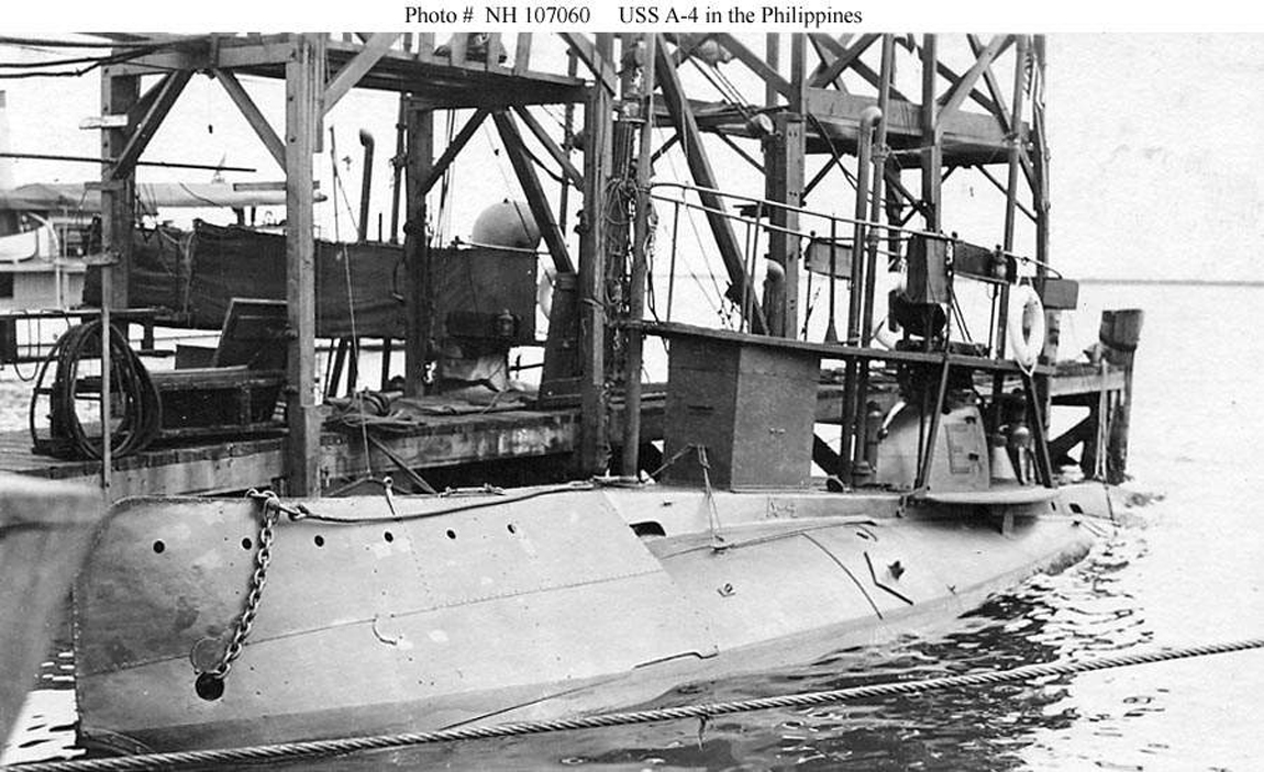 181k | Moccasin (SS-5) tied up to a wharf, probably in the Phillipines, circa 1912. | USN photo courtesy of ussubvetsofwwii.org. | |