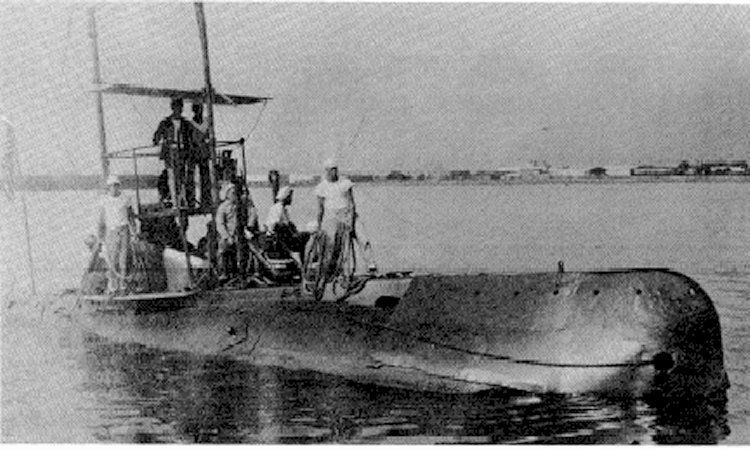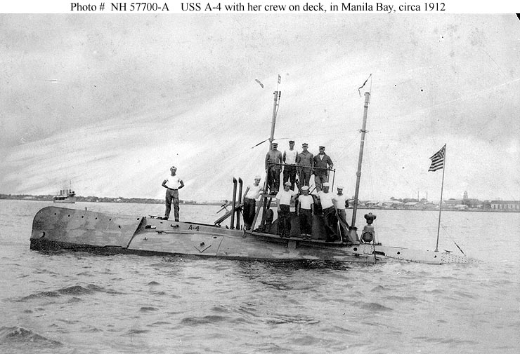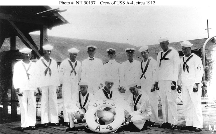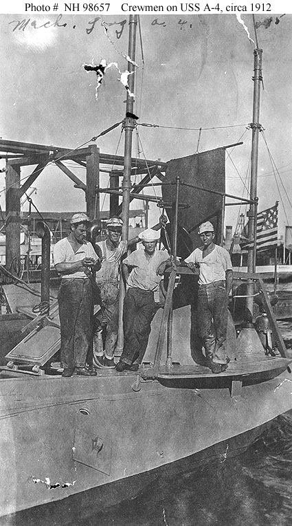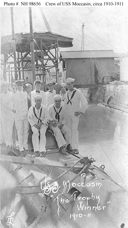 88k | Crewmen of the Moccasin (SS-5) pose on deck, circa 1910-1911. Probably taken at the Cavite Navy Yard, Philippine Islands. This submarine was renamed (A-4) in November 1911. | USNHC photograph # NH 98656. | |