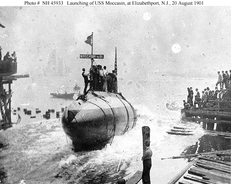 126k | Moccasin (SS-5) launching, at the Crescent Shipyard, Elizabethport, New Jersey, 20 August 1901. | USNHC photograph # NH 45933. | |