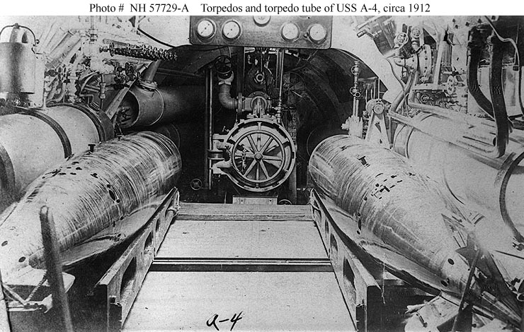 118k | View in the Moccasin's (SS-5) interior, showing two eighteen-inch torpedos and her torpedo tube door. Taken at Manila, Philippine Islands, circa 1912. Note: The torpedoes are on wooden skids. It appears that, like the loading trays of modern nuclear submarines, the skids slid across for loading. | Photo courtesy of USNHC photograph # NH 57729-A. Partial text courtesy of U.S. Submarines Through 1945, An Illustrated Design History by Norman Friedman. Naval Institute Press. | |