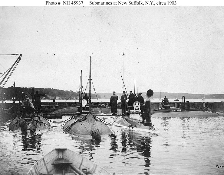 107k | Moccasin (SS-5) Electric Boat Company/Holland Torpedo Boat Company facility, New Suffolk, Long Island, New York. Submarines in the facility basin, circa 1903. Boats in the front group are (from left to right): Plunger (SS-2); Porpoise (SS-7); and Adder (SS-3). In the background, by the breakwater are (left-right): Shark (SS-8) and Moccasin (SS-5). Photographed by Legendre & Levick, New York. |
