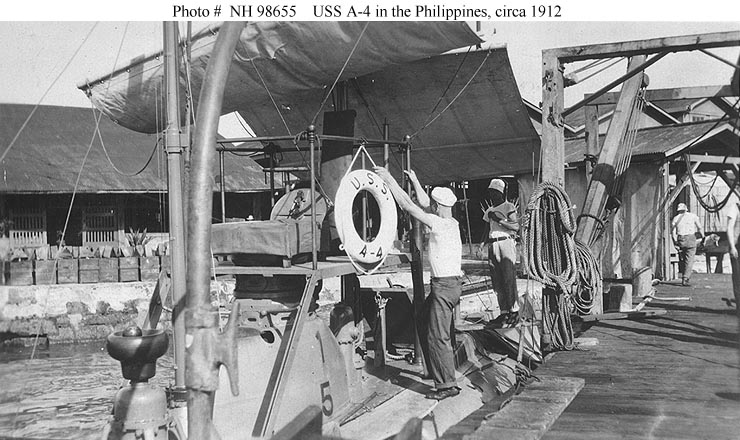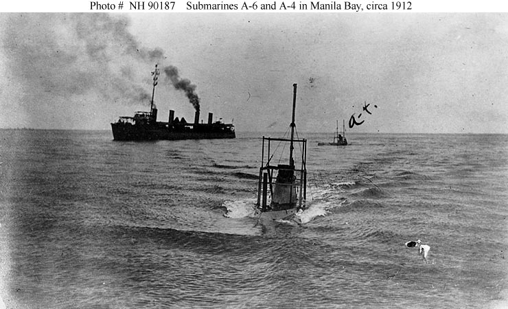 83k | Moccasin (A-4) (SS-5) & A-6 (SS-7) underway in Manila Bay, Philippine Islands, circa 1912. A-4 (SS-5) and a Bainbridge class destroyer are in the background. | USNHC photograph # NH 90187. | |