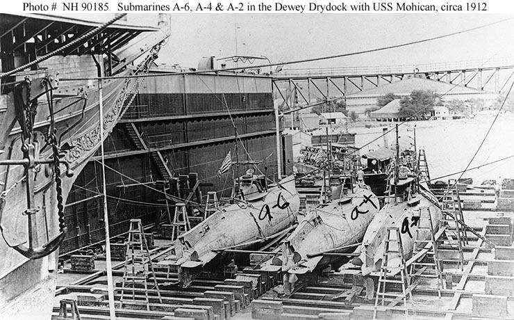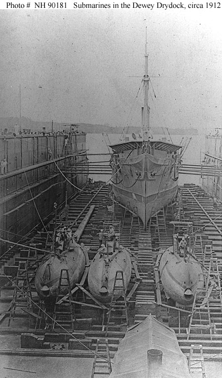 Submarines A-6 (SS-7), A-4 (SS-5) and A-2 (SS-3) in the Dewey Drydock, circa 1912.