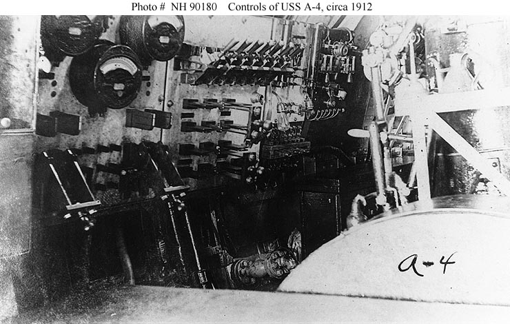 95k | View in the Moccasin's (SS-5) interior, showing her electrical switchboard and other controls. Taken at Manila, Philippine Islands, circa 1912. | USNHC photograph # NH 90180. | |