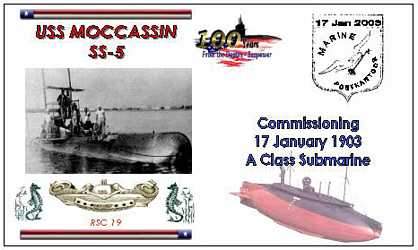 19k | Commemorative post mark on the occasion of the 100th year of the Moccasin's (SS-5) commissioning, 17 January 1903 - 17 January 2003. | Courtesy of Jack Treutle (of blessed memory). | |