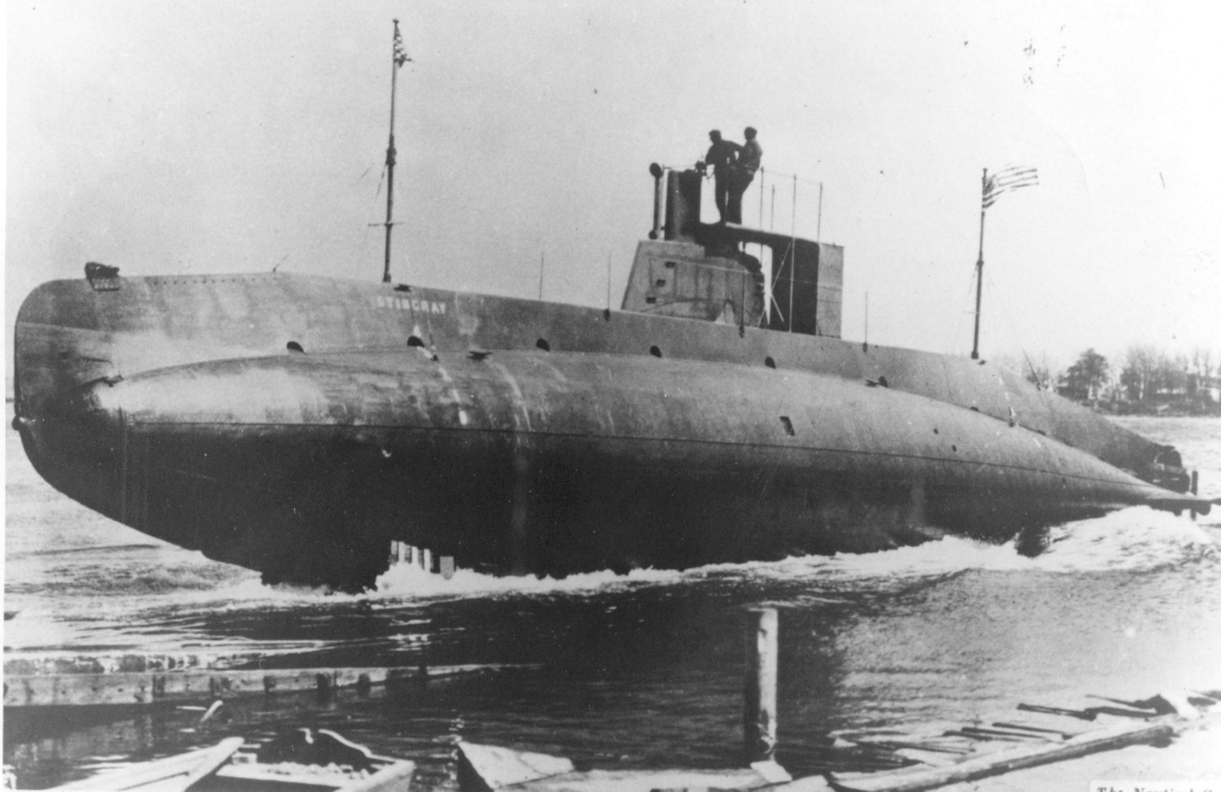 ![]() | 231k | Port side view of the Stingray (SS-13) sliding down the launching ways at the Fore River Shipyard, Quincy, Massachusetts, on 8 April 1909. | USN photo courtesy of ussubvetsofwwii.org. | |