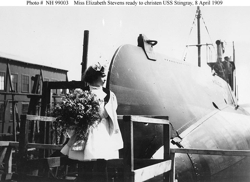 294k | Sponsor, Miss Elizabeth Stevens, holding the Sponsor's bouquet, standing near Stingray's (SS-13) bow during launching ceremonies at the Fore River Shipyard, Quincy, Massachusetts, 8 April 1909. | Photo NH-99003 courtesy of history.navy.mil via Robert Hurst. | |