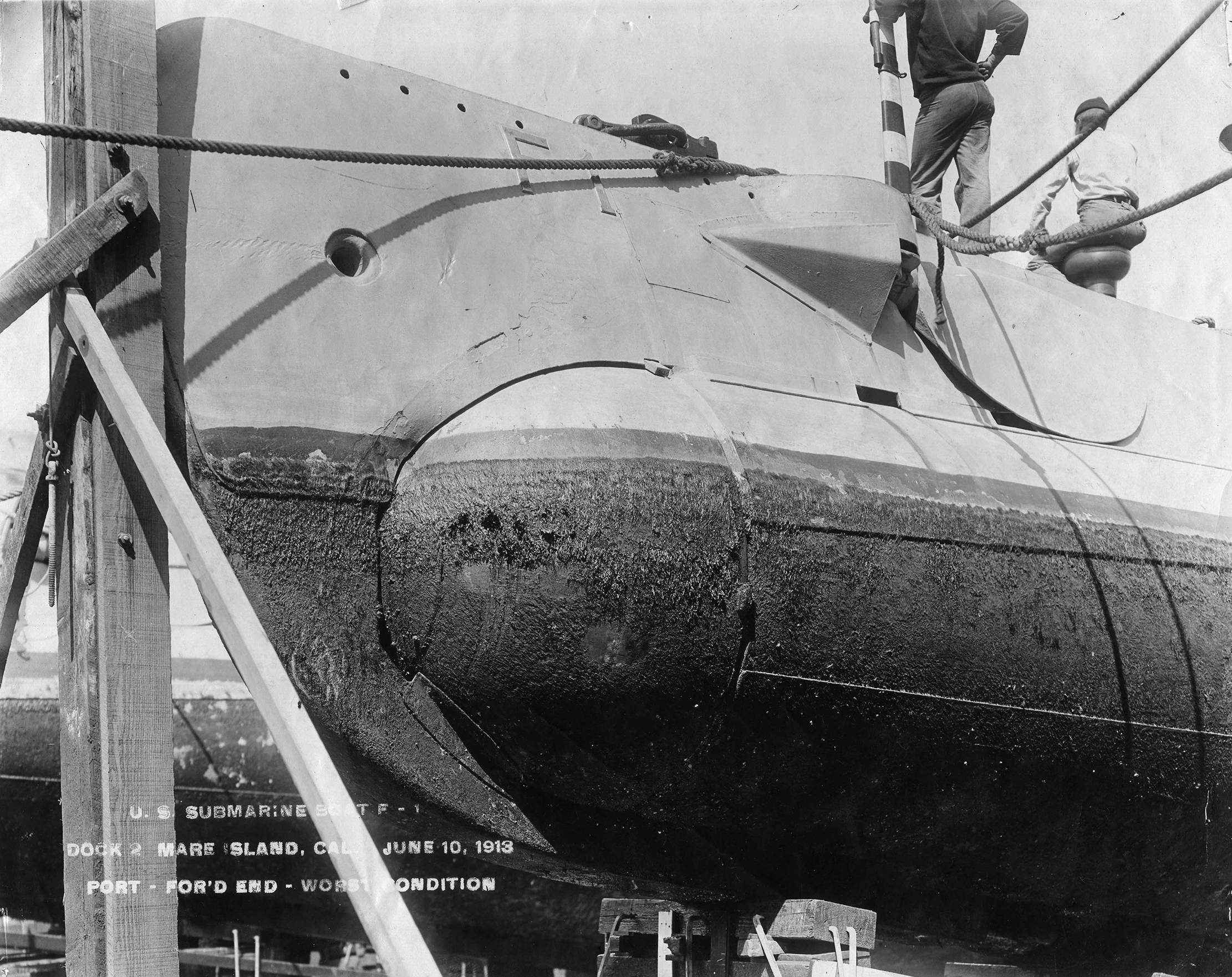 ![]() | 543k | A view of the bow of the submarine F-1 (SS-20) in dry dock #2 at Mare Island on 10 June 1913. | USN photo # 0372, courtesy of Darryl L. Baker. | ||