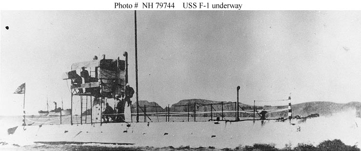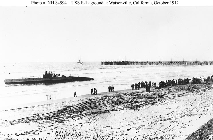 ![]() | 84k | F-1 (SS-20), aground at Watsonville, California, in October 1912. She went ashore on 11 October and was refloated on 18 October. Two men were killed in the accident. F-1 was salvaged only to later sink in a collision with her sister ship F-3 (SS-22). | USNHC photograph # NH 84994. Courtesy of Donald M. McPherson, 1976 | ||
