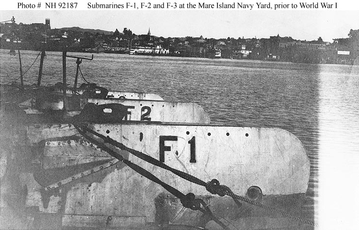 ![]() | 106k | F class (SS-20 - 23) submarines at the Mare Island Navy Yard, California, before World War I. This view shows the bows of F-1 (SS-20), F-2 (SS-21), & F-3 (SS-22). | USNHC photograph # NH 92187. Collection of Thomas P. Naughton, 1973. | ||