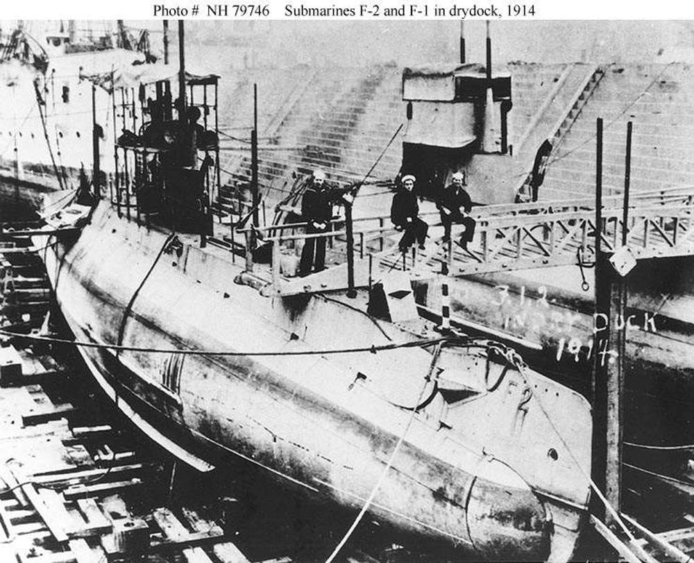 ![]() | 132k | F-2 (SS-21) in drydock in 1914, with her sister F-1 (SS-20) alongside. | USNHC photograph # NH 79746, courtesy of Donald M. McPherson, 1976 via Robert Hurst. | ||