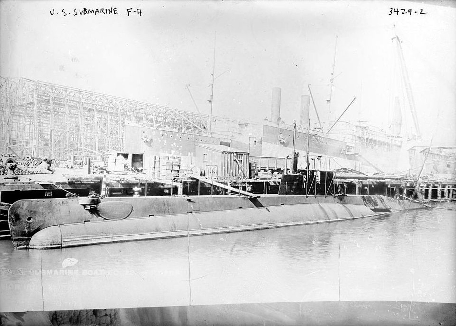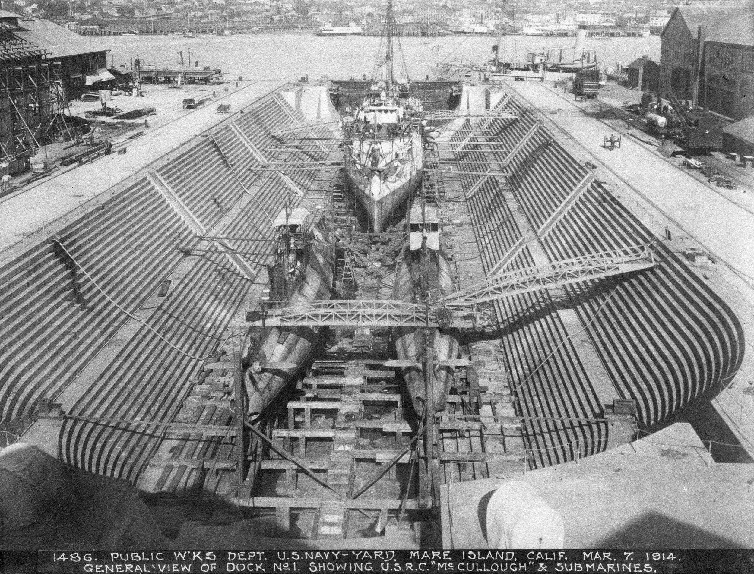 985k | The submarine F-2 (SS-21) (left) and F-1 (SS-20), (right) and the USRC McCulloch are seen in Mare Island Navy Yard Dry Dock #1 on 7 March 1914. | USN photo / MINSY # 1486-3-1914 courtesy of Darryl L. Baker. | ||