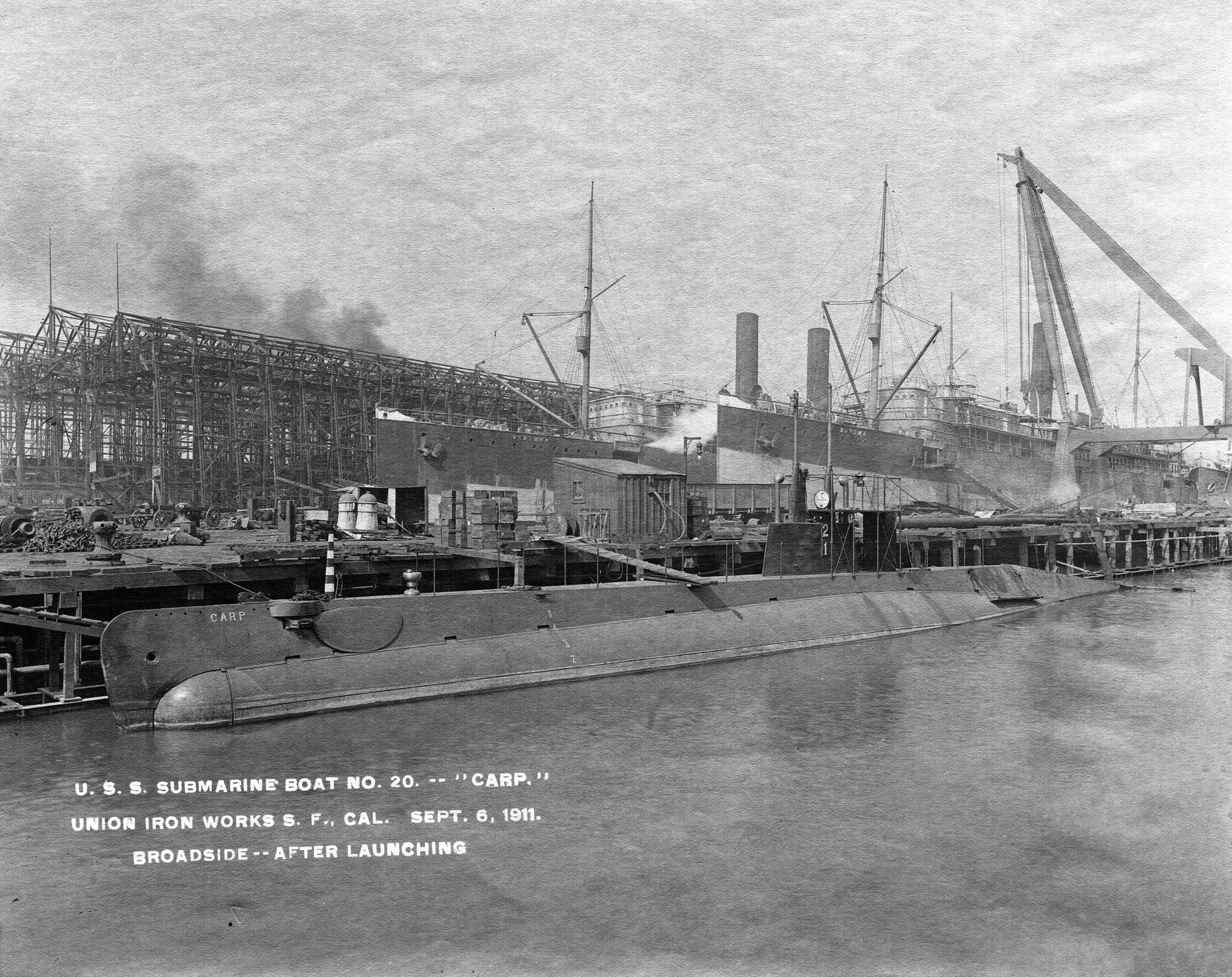 ![]() | 1.35k | The submarine Carp (SS-20) after her launching at Union Iron Works, San Francisco on 6 September 1911. | Photo courtesy from the files of the Vallejo Naval & Historical Museum courtesy of Darryl L. Baker. | ||