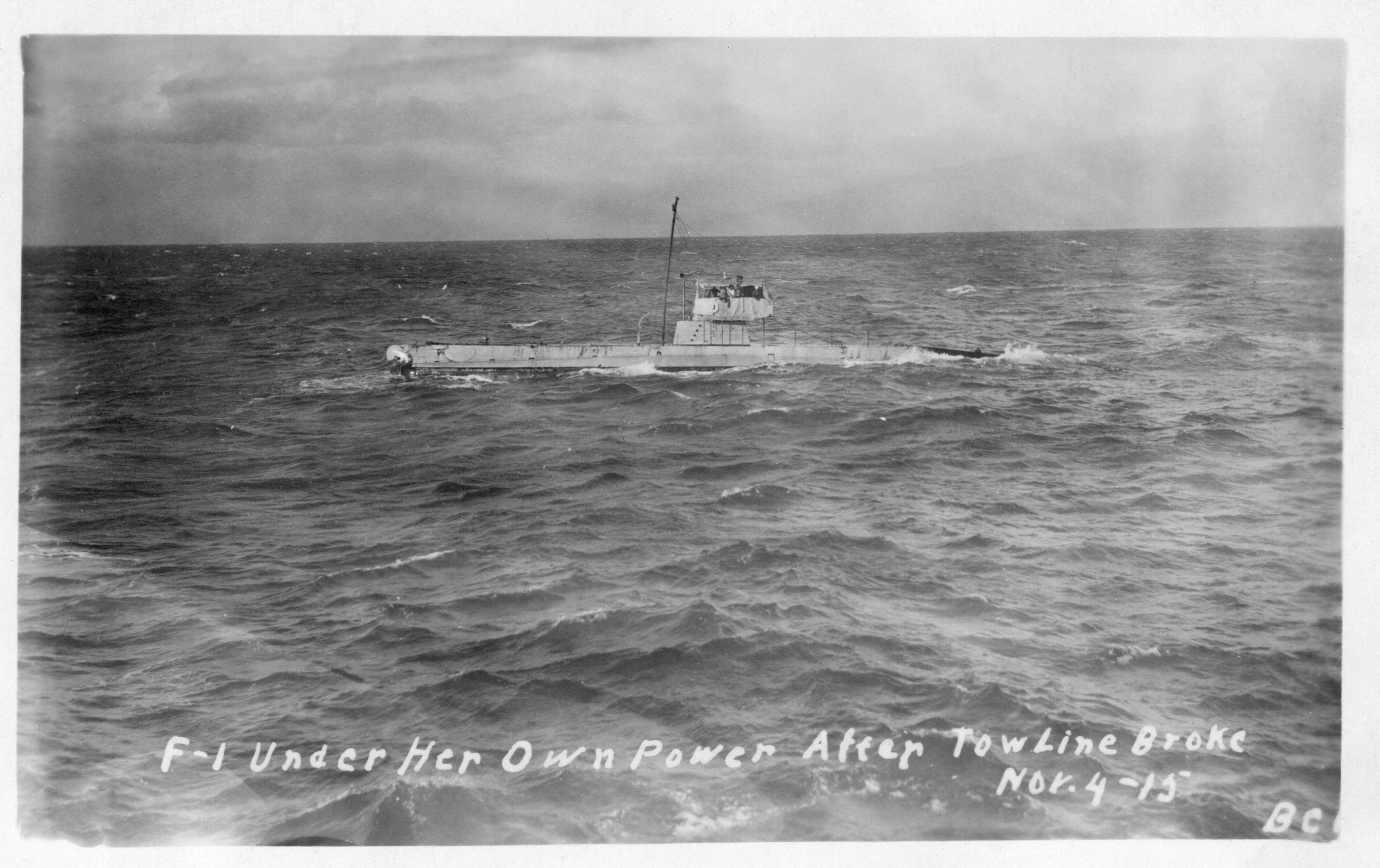 884k | F-1 (SS-20) under her own power off Honolulu to meet Iroquois (AT 46) for towing to California on 4 November 1915. | Image and text provided by Vallejo Naval & Historical Museum via Darryl L. Baker. | ||