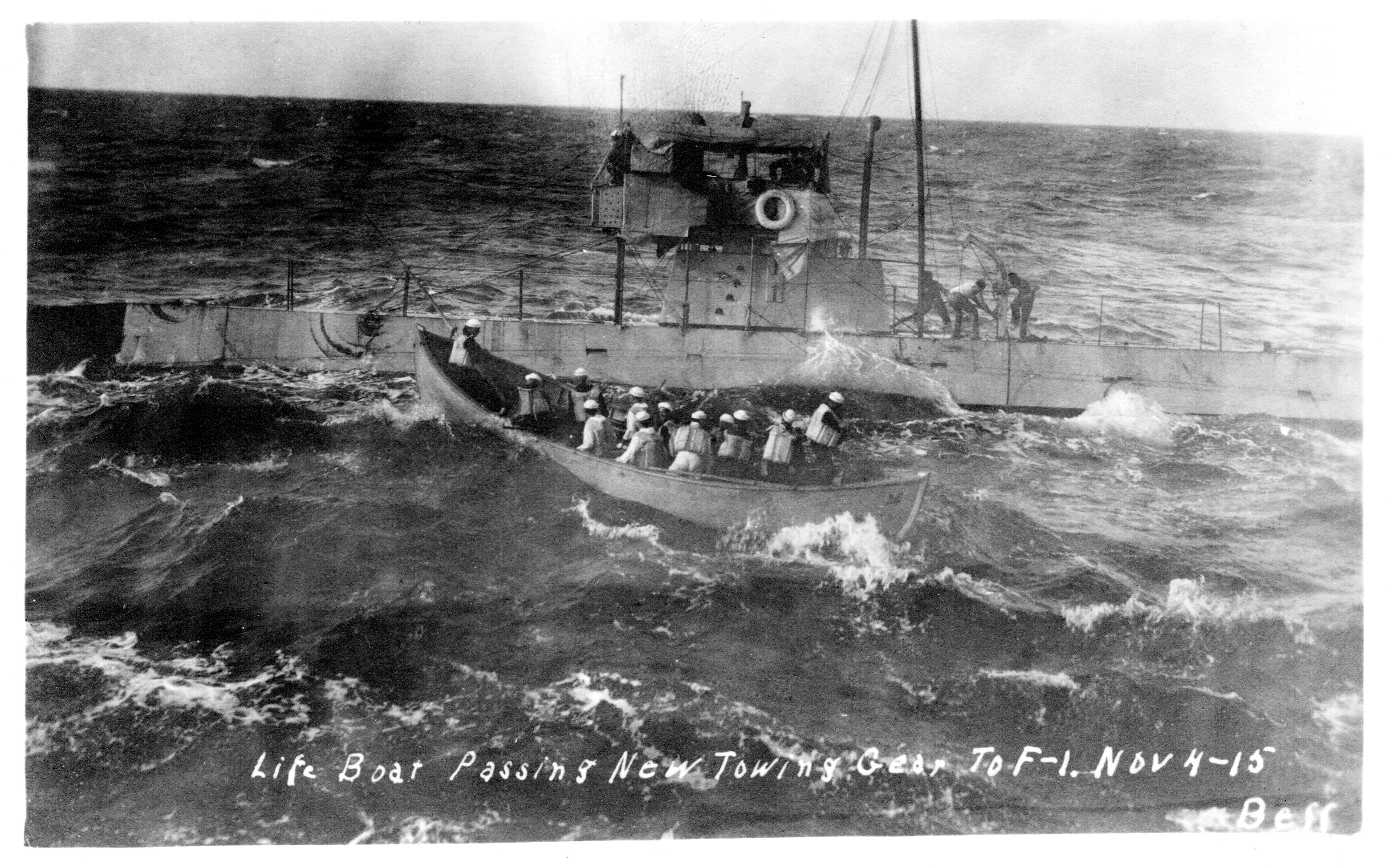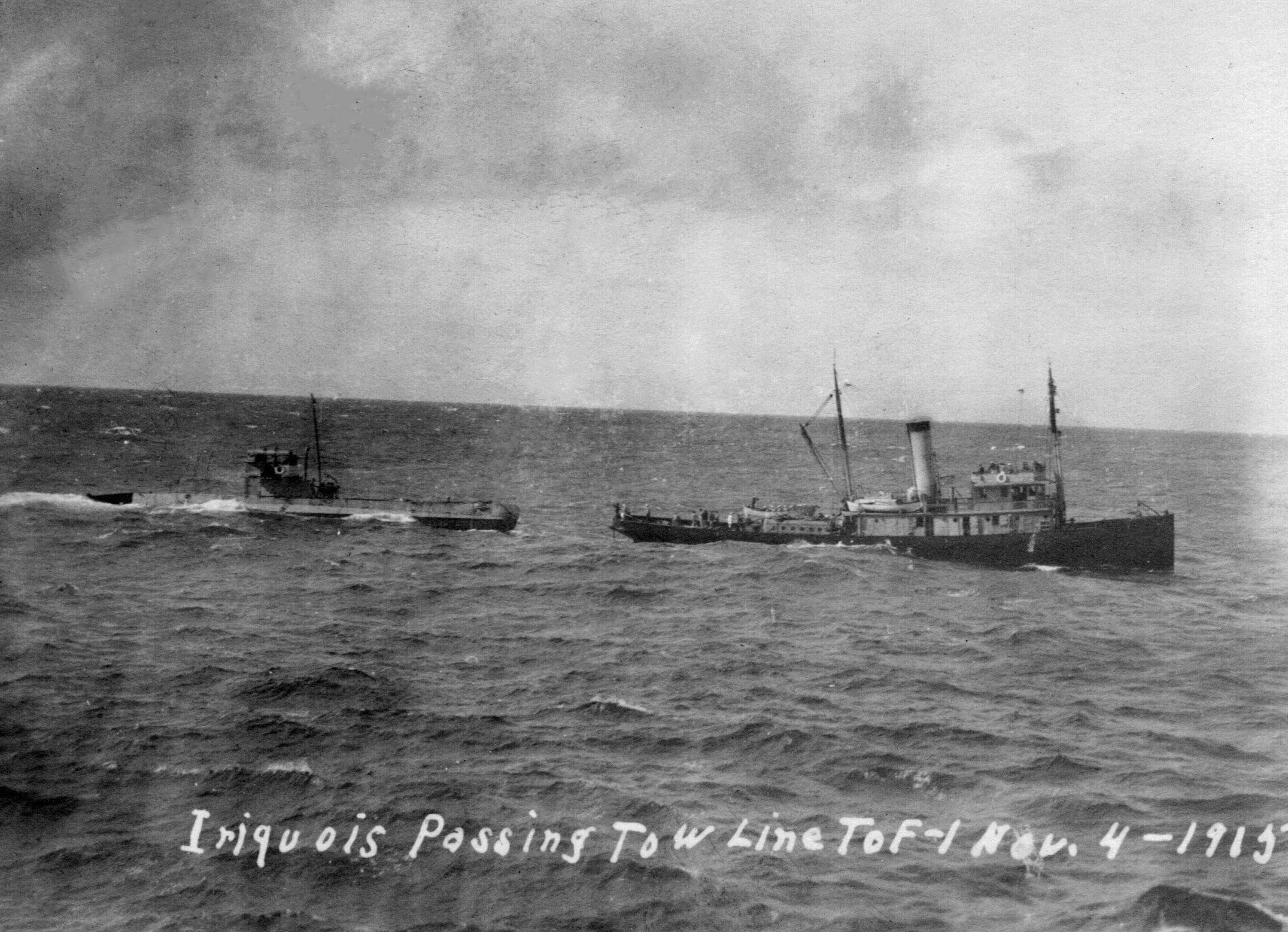 1.09k | Iroquois (AT 46) passing tow line to F-1 (SS-20) on 4 November 1915. | Image and text provided by Vallejo Naval & Historical Museum via Darryl L. Baker. | ||
