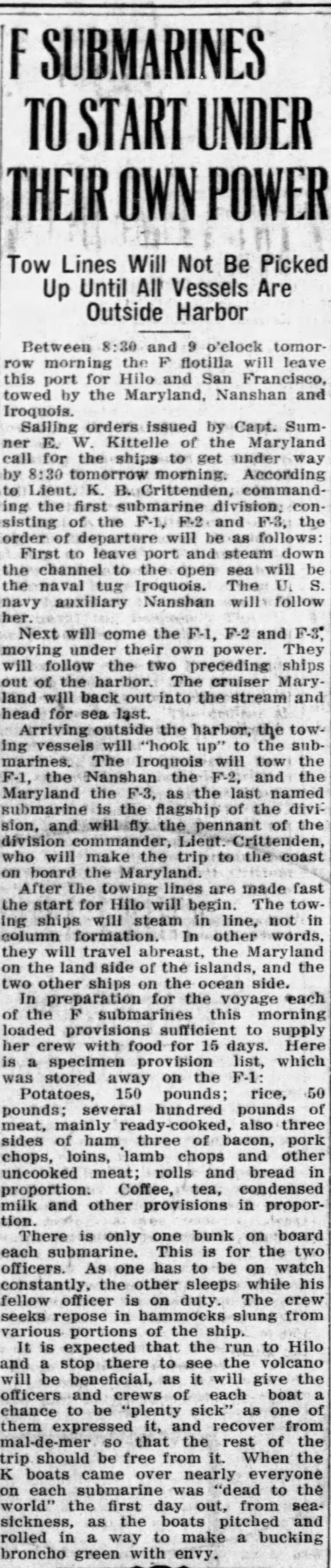 975k | F SUBMARINES TO START UNDER THEIR OWN POWER. | Image and text provided by University of Hawaii at Manoa; Honolulu, HI. Photo from the Honolulu Star-Bulletin. [volume] (Honolulu [Oahu, Hawaii]) 1912-2010, 28 October 1915, 3:30 Edition, Image 2, courtesy of chroniclingamerica.loc.gov. | ||