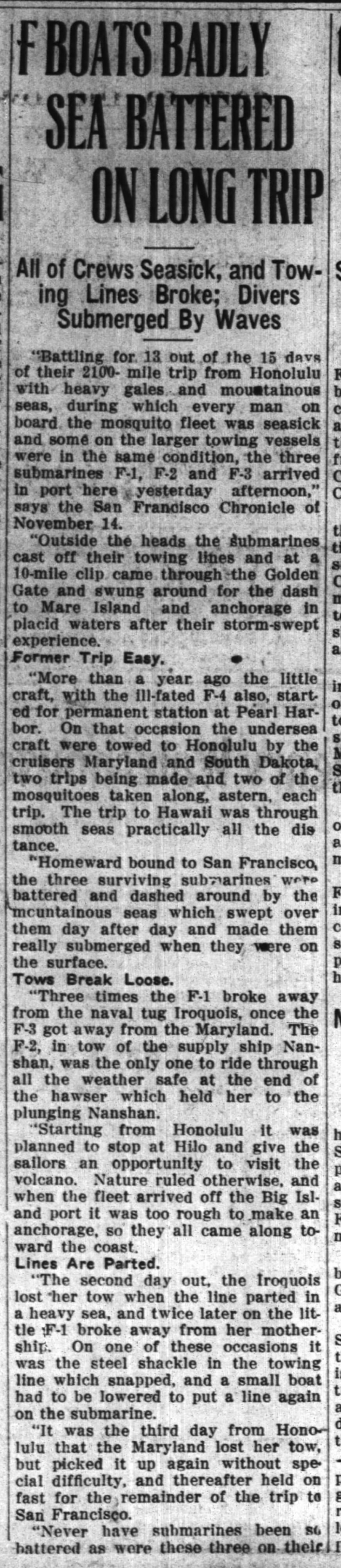 NR | F BOATS BADLY SEA BATTERED ON LONG TRIP. | Image and text provided by University of Hawaii at Manoa; Honolulu, HI. Photo from the Honolulu Star-Bulletin. [volume] (Honolulu [Oahu, Hawaii]) 1912-2010, 22 November 1915, 2:30 Edition, Image 2, courtesy of chroniclingamerica.loc.gov. | ||