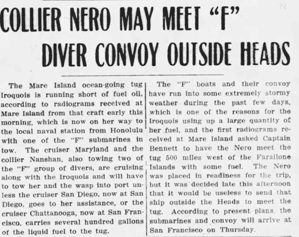 NR | NINETEEN KILLED ON U. S. SUBMARINE F-1 (SS-20) Is Rammed and Sunk by F-3 (SS-22) in Home Waters. FIVE SURVIVORS PICKED UP Commanding Officer Among Those Saved Lost Diver Broke World’s Record for Depth in San Francisco Bay. |