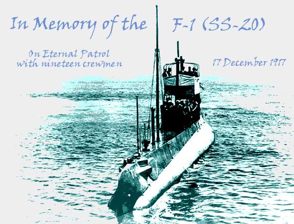 1.21k | Seas Smash Submarine F-1(SS-20) Two Sailors Die in Disaster Submarine F-1, champion of the diving flotilla of Uncle Sam's navy, which was wrecked in Monterey bay near Watsonville at daybreak on Friday. |