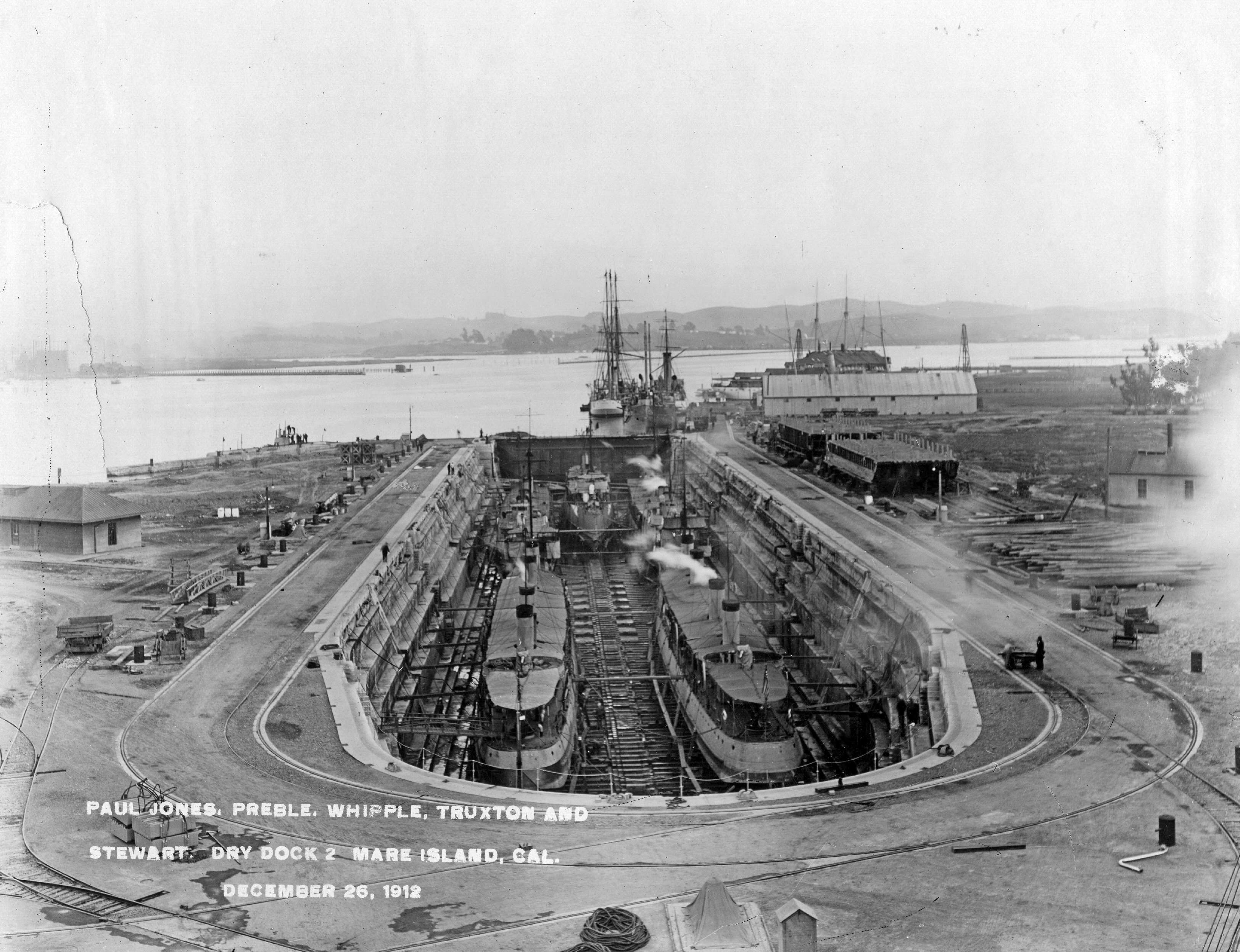 757k | Five destroyers in Mare Island dry dock #2 on 26 December 1912 taken from dock head of dock. Head end of the dock looking toward channel: Paul Jones (DD-10) and Preble (DD-12).