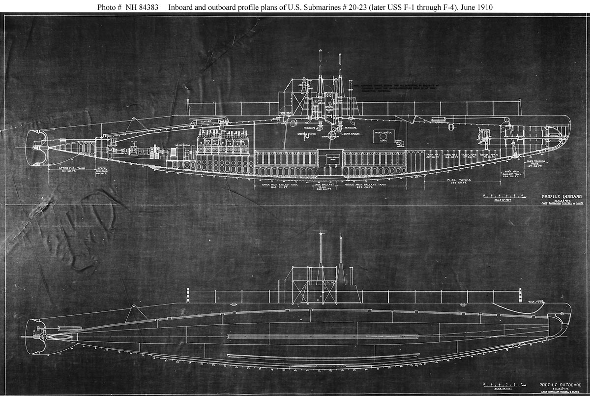 ![]() | 210k | U.S. submarines (SS-20) through (SS-23). General plans prepared by the Fore River Shipbuilding Company, Quincy, Massachusetts, 18 June 1910. This sheet features inboard and outboard profile drawings. These submarines were constructed by the Union Iron Works, San Francisco, California. Initially named Carp (SS-20), Barracuda (SS-21), Pickerel (SS-22) and Skate (SS-23), they were renamed F-1 (SS-20) through F-4 (SS-23) in November 1911, while under construction. The original plan is in Record Group 19 at the U.S. National Archives. | USNHC photograph # NH 84383. Courtesy of Donald M. McPherson, 1976. | |||