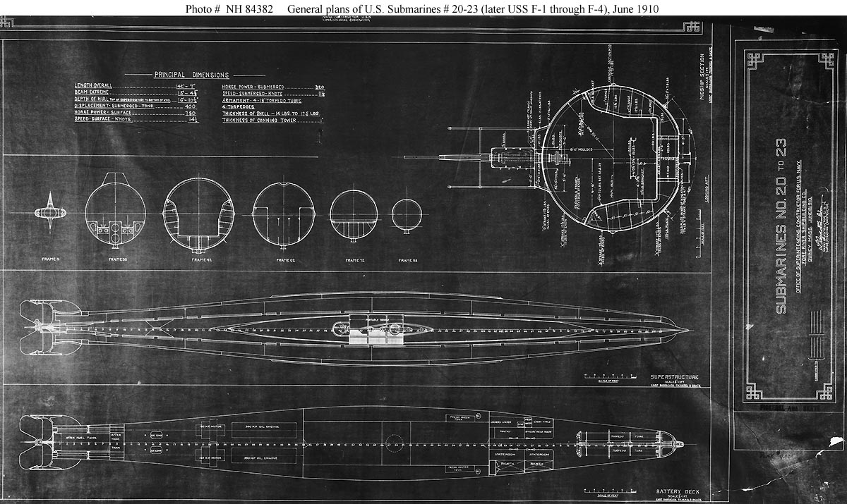 ![]() | 201k | U.S. Submarines (SS-20) through (SS-23). General plans prepared by the Fore River Shipbuilding Company, Quincy, Massachusetts, 18 June 1910. This sheet features a table of dimensions, deck plans and hull section drawings. These submarines were constructed by the Union Iron Works, San Francisco, California. Initially named Carp (SS-20), Barracuda (SS-21), Pickerel (SS-22) and Skate (SS-23), they were renamed F-1 (SS-20) through F-4 (SS-23) in November 1911, while under construction. The original plan is in Record Group 19 at the U.S. National Archives. | USNHC photograph # NH 84382. Courtesy of Donald M. McPherson, 1976. | |||
