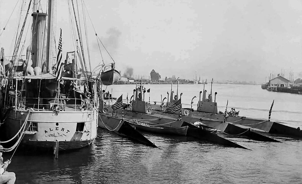 124k | Tender Alert (AS-4) at Long Beach CA., circa 1914 with several subs alongside. The one next to the Alert is not identifiable, the F-3 (SS-22) second inboard, third boat can't be identified due to flag & F-4 (SS-23) is outboard. | Photo courtesy of Vernon P. Maxson, Jr. LCDR,USNR-R-RETIRED (SS) (former crew member, PARGO-SS-264) & Ric Hedman. | |||