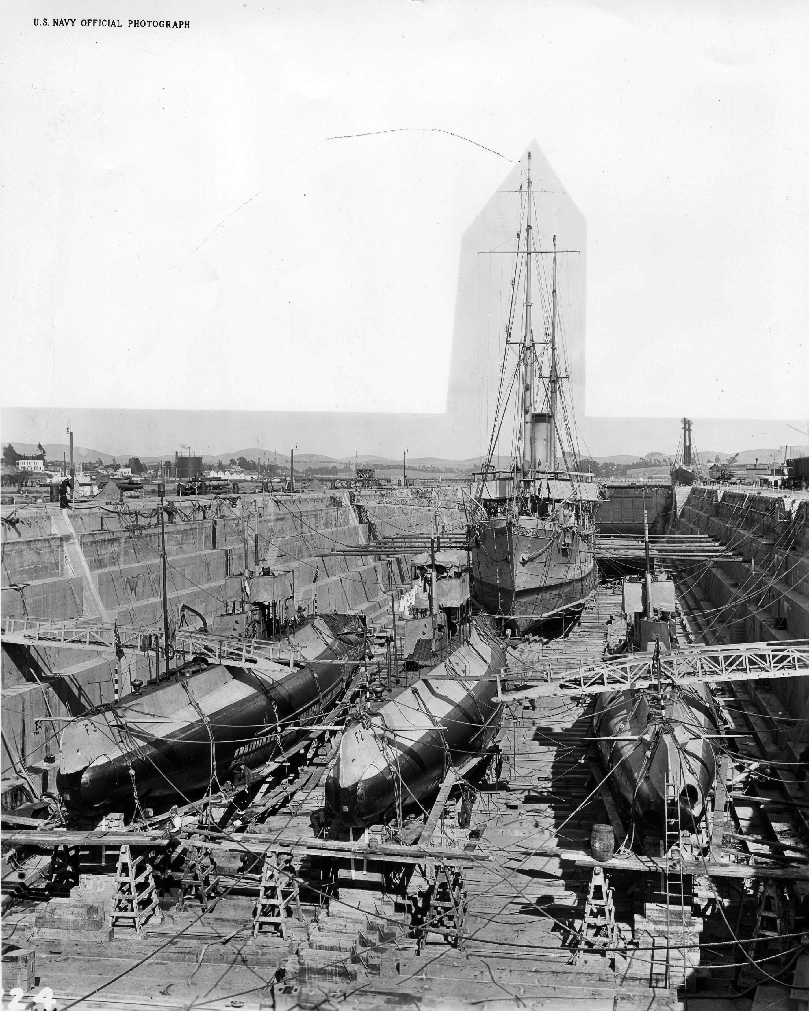 994k | F class (SS-20 - 23) submarines and their tender are in DD#2 at Mare Island on 21 January 1913. Left to right: F-3 (SS-22), F-2 (SS-21), F-1 (SS-20) and Alert (AS-4) in the background. | USN photo / MINSY # 01211913-01 courtesy of Darryl L. Baker. | |||