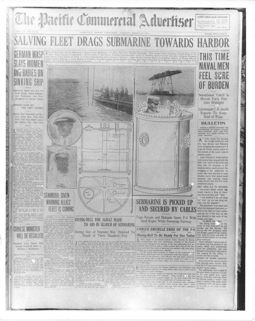 1.03k | HUMAN INGENUITY IS TAXED TO GET SAFE SUBMARINE F-4 STILL LOST; SEARCH KEPT UP AND HOPES FOR 21 MEN ARE HIGHER | Image and text provided by University of Hawaii at Manoa; Honolulu, HI. Photo & text by Honolulu Star-Bulletin. (Honolulu [Oahu, Hawaii) 1912-current, 26 March 1915, 2:30 Edition, Images 1 & 2, courtesy of chroniclingamerica.loc.gov. |