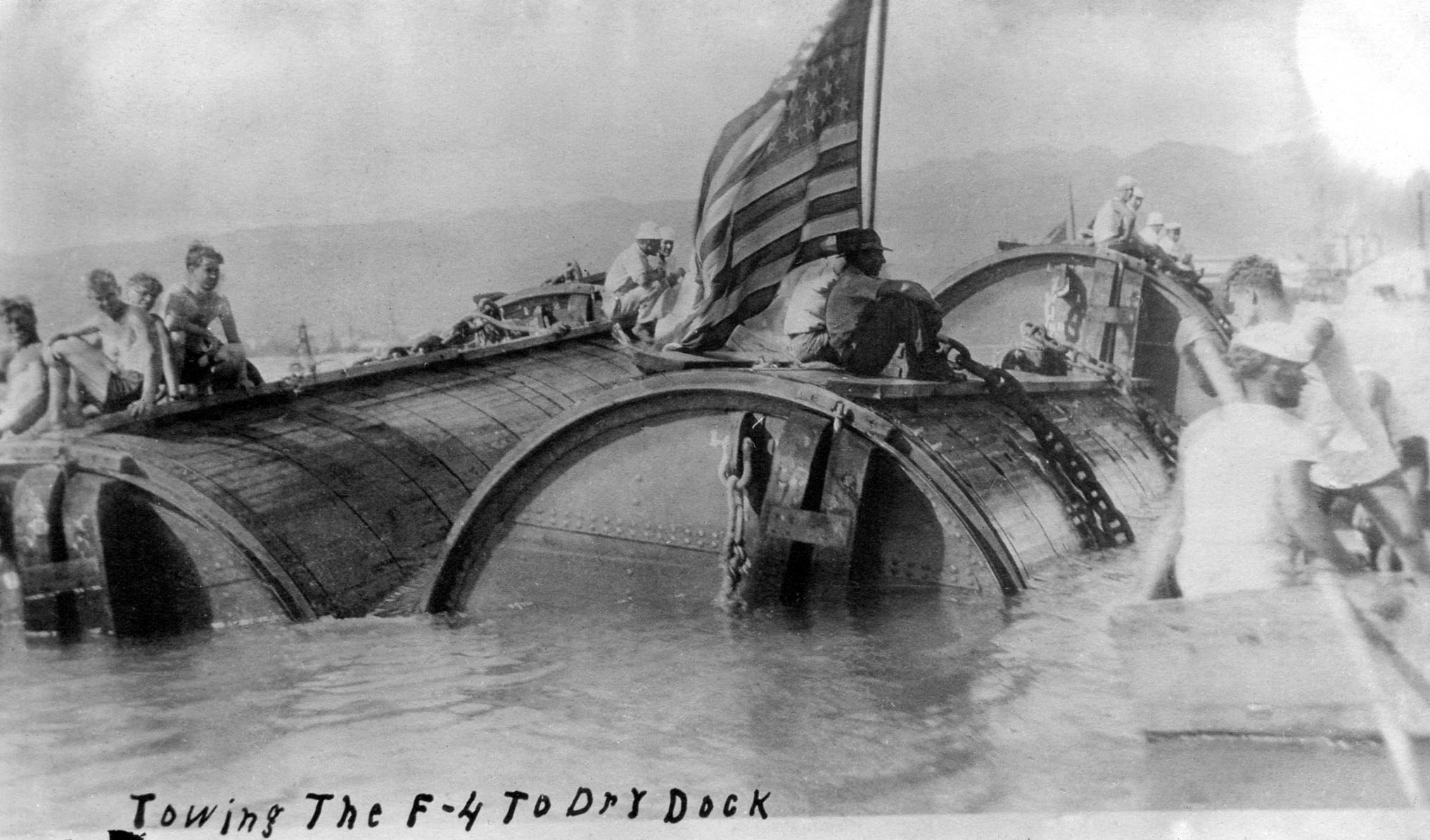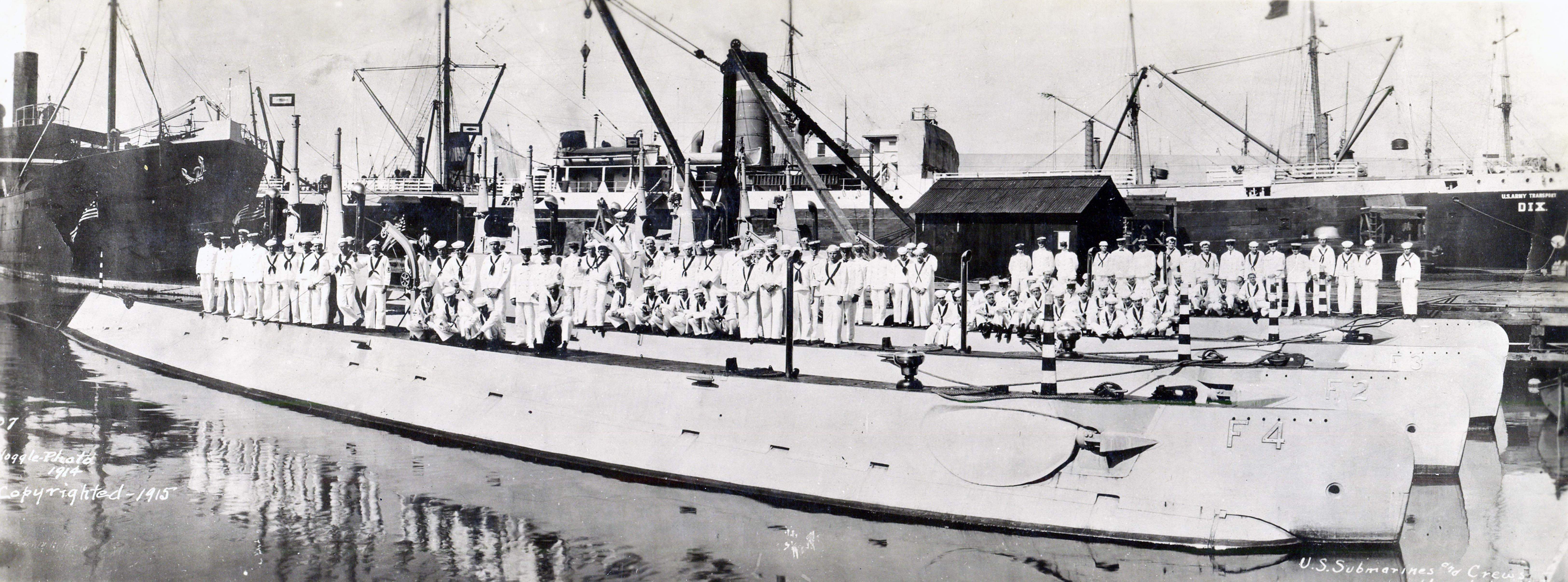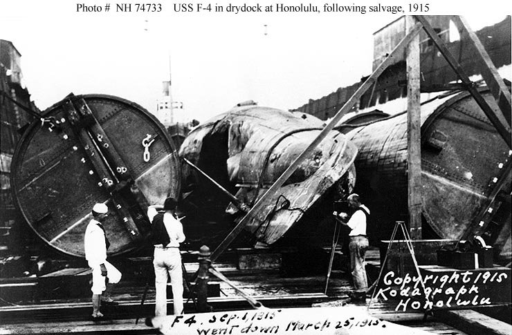 NR | SEARCHERS HAVE HIGH HOPES F-4 (SS-23) IS LOCATED; WILL TRY TO RAISE IT. THE SUBMARINE F-4 PHOTOGRAPHED IN HARBOR | Image and text provided by University of Hawaii at Manoa; Honolulu, HI. Photo & text by Honolulu Star-Bulletin. (Honolulu [Oahu, Hawaii) 1912-current, 26 March 1915, 3:30 Edition, Image 1, courtesy of chroniclingamerica.loc.gov. |