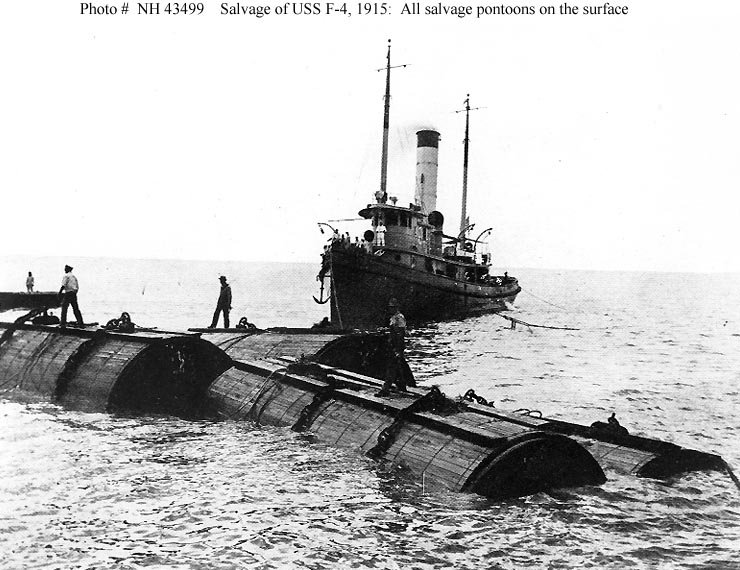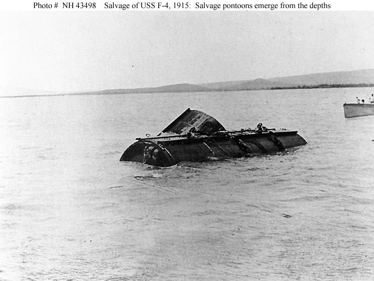 86k | Salvage of F-4 (SS-23), circa 29 August 1915. Salvage pontoons on the surface, off Honolulu, after the final lifting of the sunken submarine in preparation for towing her into Honolulu harbor. Note wooden protective sheathing around the pontoons. Salvage equipment was devised by Naval Constructor Julius A. Furer. The tug is probably Navajo. | USN photo # NH 74732, from the collections of the US Naval Historical Center. Photo courtesy of Donald M. McPherson, 1972. |