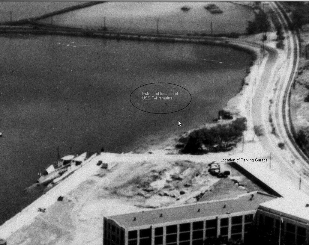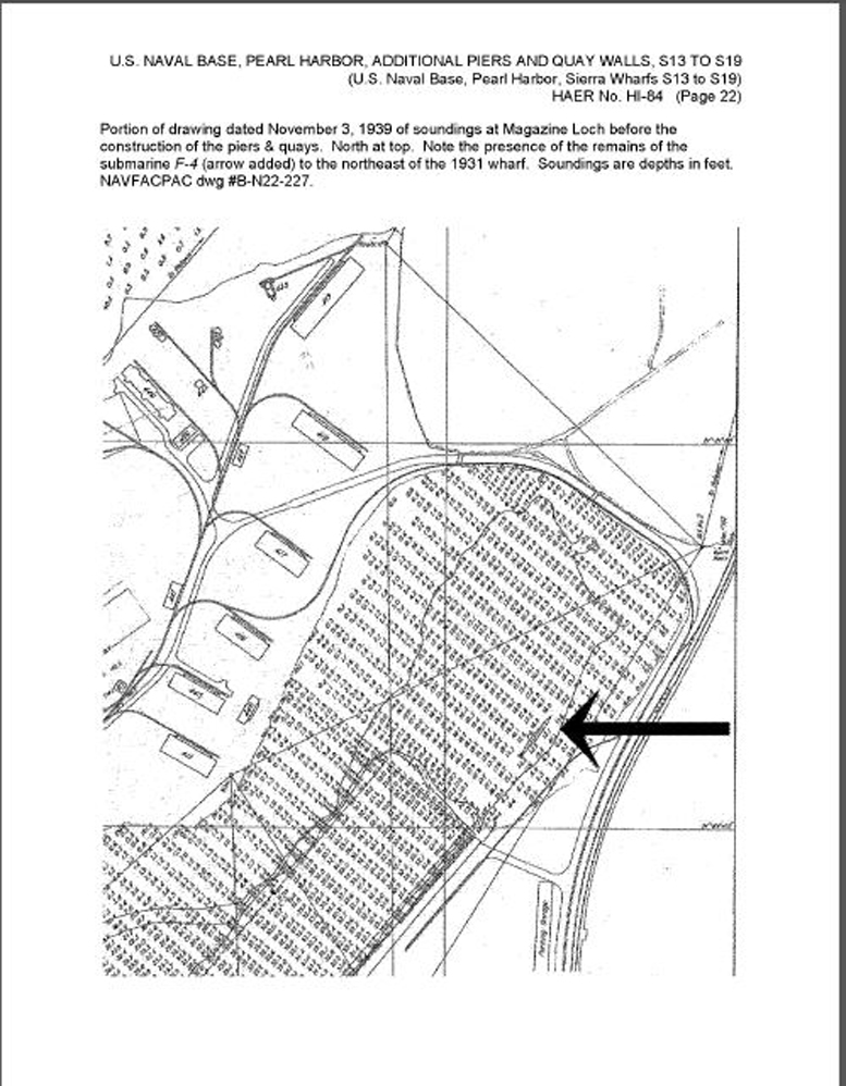 376k | While in the Inter-Island Company drydock, F-4 (SS-23) was inspected to determine the cause of her loss, and the bodies of her crew were removed for military burial. Anything useful, including her engines, were stripped from the boat. In September 1915 she was refloated from the dock with the same pontoons and towed into Pearl Harbor a few miles down the coast. She was towed under the pontoons into Magazine Loch until she grounded in the shallow inlet. She sat in this position, peacefully resting in the water until 1940. At that time there were plans afoot for the construction of the Sierra pier and other new facilities for the growing submarine base. It was found that the hulk of the F-4 was in the way. A trench was dredged alongside the wreck and she was rolled into it, thus clearing the way for the pier construction and eliminating her as a collision threat. A 1999 magnetometer survey of the waters near pier Sierra 14 detected a massive object, approximately 80 feet from the pier and buried under at least 20 feet of sediment. This is the F-4, resting in her grave. She is still there to this day. It was reported at one point that the hulk had been pushed up onto the beach for temporary storage, but this report is actually false. | Text courtesy of David Johnston | |||